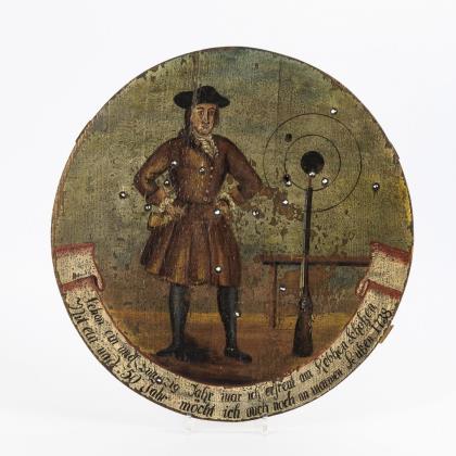 Schützenscheibe mit der Standfigur eines Mannes neben dem Gewehr; im Hintergrund eine Schießscheibe sowie etliche Einschüsse
