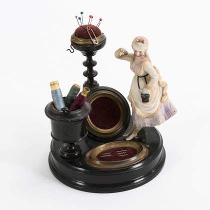 Kokette Dame mit Fernglas, 3 Nadelkissen und 1 Garnrollen-Behälter