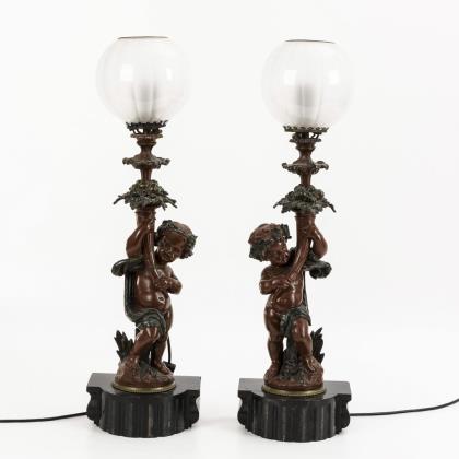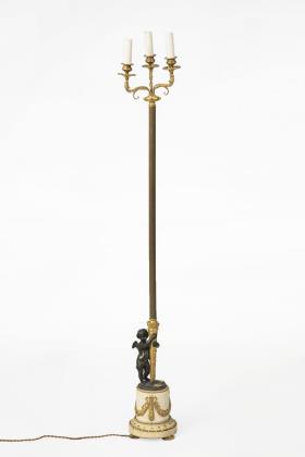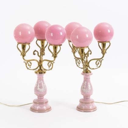 Keramik-Balusterschaft mit je 2 gleichen Liebespaaren, 3 verzierte Messingarme mit Kugelglasschirmen. Funktionieren