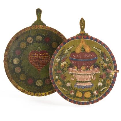 Beidseitig Waffelmuster mit Monogramm "WH", Rankenornament mit "HH 1825", Spiralornament mit Vögeln und Blumen, am Rand "IH:ROM:BERG:"