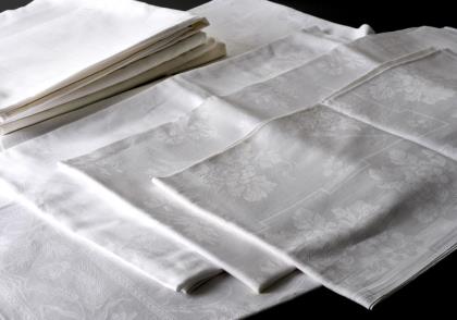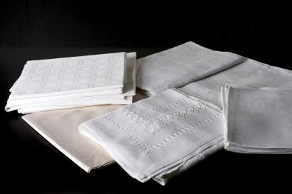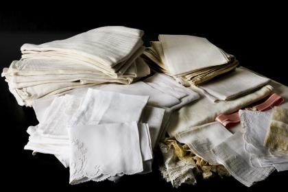 11 verschiedene Tischtücher, 25 Handtücher, 2 Stück Leinen, 8 Servietten, 4 Taschentücher, 1 Spitzeneinsatz und 1 Wäscheband