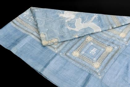 Feines Tuch mit großen, gestickten Drachenmotiven, Floralstickereien und asiatische Zeichen. Dazwischen verschieden handgearbeitete Spitzeneinsätze