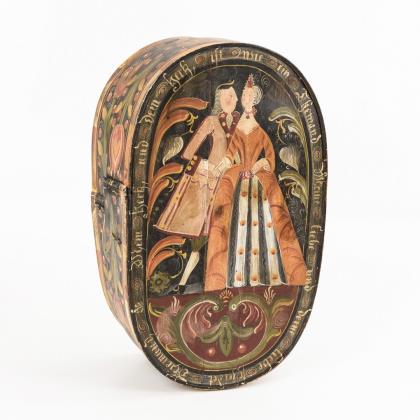 Wandung mit umlaufenden Blumen auf schwarzem Grund; auf dem Deckel Liebespaar in spätbarocken Kostümen sowie Sinnspruch