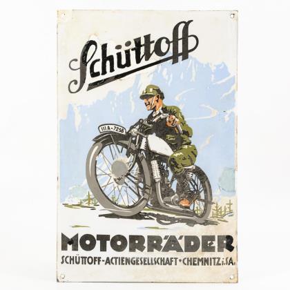 Motorradfahrer vor den Alpen aus der Froschperspektive. "Schüttoff Motorräder / Schüttoff-Actiengesellschaft + Chemnitz i SA."