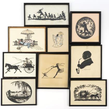 Liebespaar in der Kutsche (signiert Eva Schönleber), "Der Rattenfänger (Gertrud Richter), Karikatur Rollschuhdame und Herr (Weidner), Frauenakt mit Tuch (undeutlich Schliepstein), "Bismarck" mit Pfeife (undeutlich Alf. Rinke?). Unsigniert: Frau mit Putten, lesende Dame, Kutsche fahrende Dame und Dame mit Putto im Boot