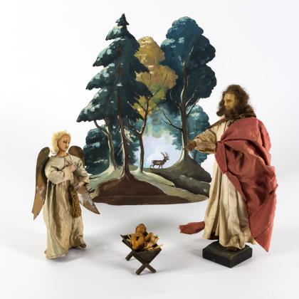 Bärtiger Hirte und Engel in langen Gewändern; 1x auf Plinthe. / 2 liegende Jesuskinder mit Hüfttuch. Krippe und bemalte Kulisse ergänzt