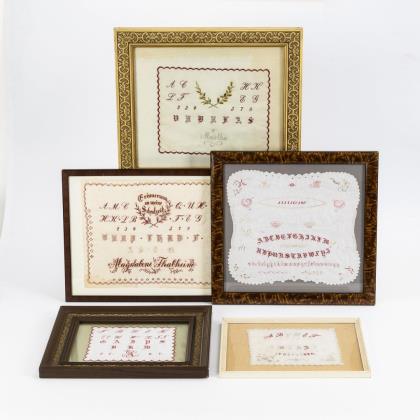 Verschiedene Tücher mit ABC-Stickereien, verglast und gerahmt