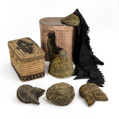 Zigarettenspitze, Nadelbehälter und Bleistift aus Silber. 4 Taschen und 3 Geldkatzen zumeist mit Perlstickerei, teils mit Pampel-Abhängung. Gepunzte Messing-Doppeldose, Backrädchen, 2 Scheren (1 "Hebammenschere"), reliefierter Kammhalter, Necessaire mit Haken, Spatel und Bleistift sowie Aufschrift "Jubiläums-Ausstellung Mannheim 1907", Teil einer Flohfalle aus Bein