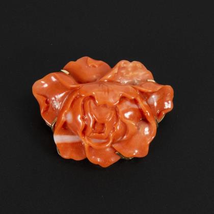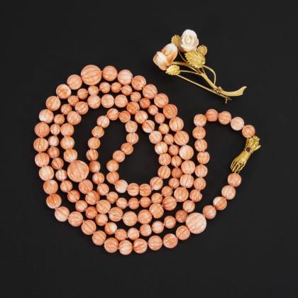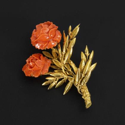 Schnürkette mit geschnittenen Korallenkugeln, an kleiner Handschließe mit 2 eingelassenen Rubinen. Plastischer Blumenzweig mit 2 geschnittenen Rosenblüten. Kugelhaken