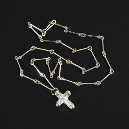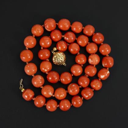 Schnürkette mit Korallenkugeln in Einzelverknotung, an reliefierter Kugelschließe. Nachtrag vom 13.10. 2021: Verschlusshaken defekt.