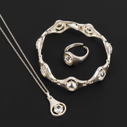Anhänger, Armband und Ring mit Bergkristallen. Zarte Ankerkette, Klippverschluss und offene, mittlere Schiene