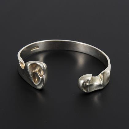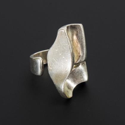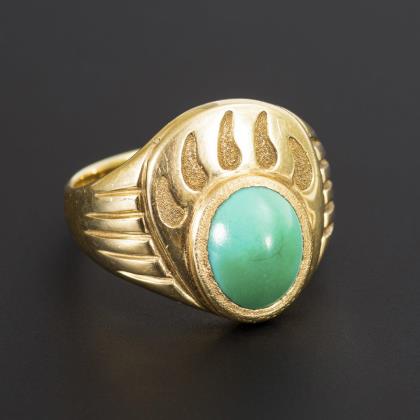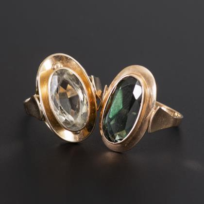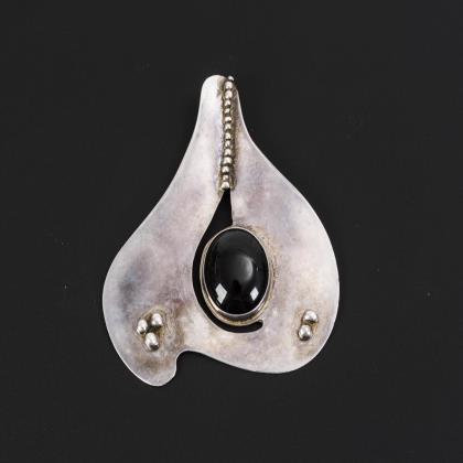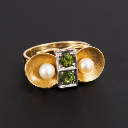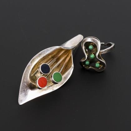 Plastische, stilisierte Blütenbrosche mit 3 emaillierten "Blütenstempeln". Kugelhaken. Ring mit 4 kleinen Grünachatkugeln. Offene Schiene