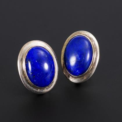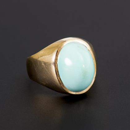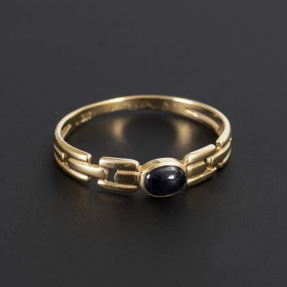 Saphircabochon zwischen kettenartig durchbrochener Mitte. Schmale Schiene