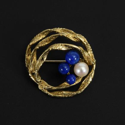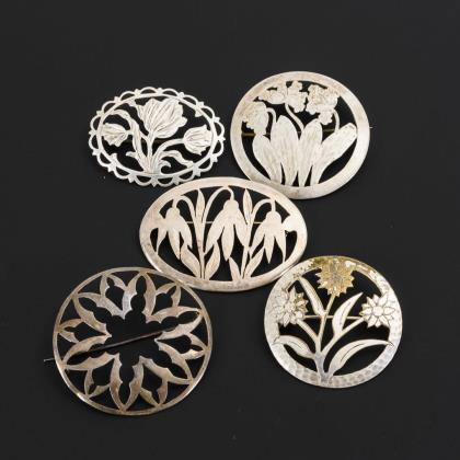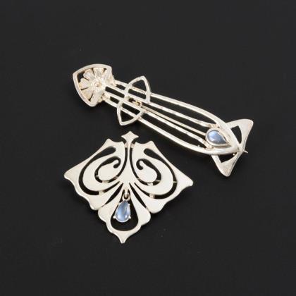 Durchbrochen gearbeitete Broschen mit kleinen Mondsteincabochons. Kugelhaken
