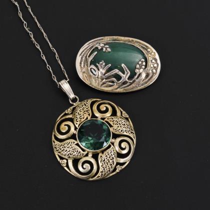 Ornamentanhänger mit Imitation an Ziergliederkette mit Hakenverschluss. Brosche mit Grünachat-Einlage. Hakenverschluss