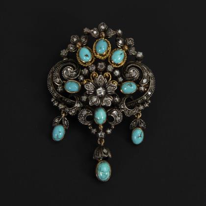 Ornamentbrosche mit Abhängungen, besetzt mit kleinem Brillant, diversen Rosendiamanten und zargengefassten Türkiscabochons. Kugelhaken, starre Öse