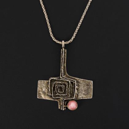 Strukturierter Anhänger mit Rosenquarzcabochon, an Ziergliederkette mit Karabinerschließe