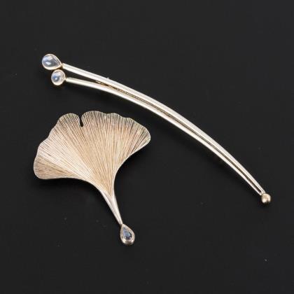 Ginkgokoblatt und lange Stabnadel mit Opalcabochons. Kugelhaken