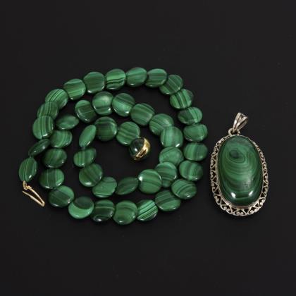 Schnürkette mit Malachit-Scheiben, an Kugelschließe. Großer Malachitcabochon in Zierrahmen