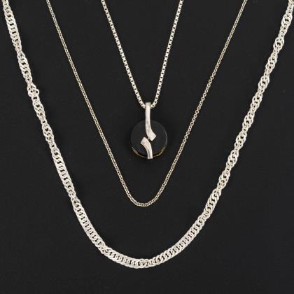 Kleiner Onyxanhänger an Venezianerkette. Gedrehte Panzerkette und zarte Ankerkette mit Ringfederschließen