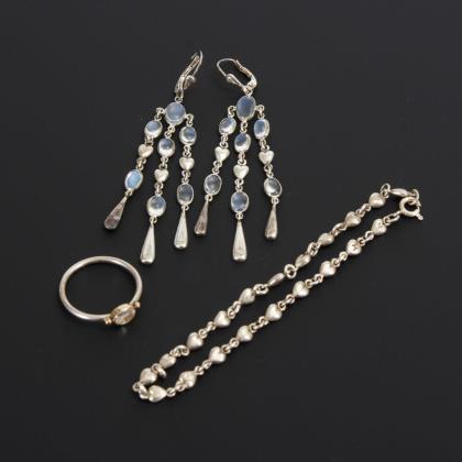 Girandolenpaar mit abgehängten Mondsteincabochons an Federbügel. Passendes Armband mit kleinen Herzgliedern an Ringfederschließe. Ring mit Opalcabochon zwischen schmaler Schiene