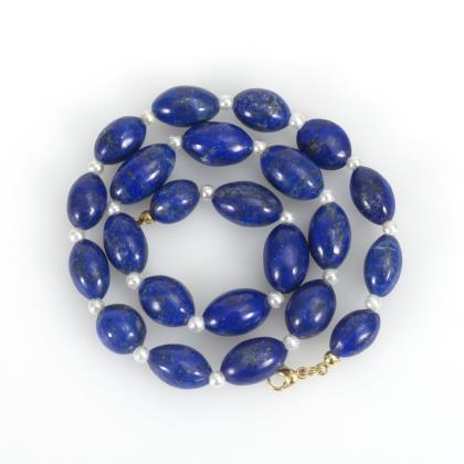 Schnürkette mit Lapis-Oliven und kleinen Kunstperlen im leichten Verlauf, an Karabinerschließe