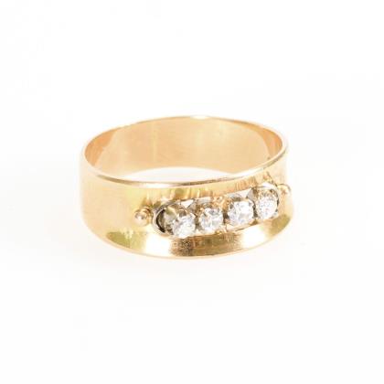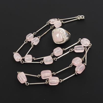 Stabgliederkette mit Rosenquarzen, an Ringfederschließe. Ring mit Steincabochon und farblosen Steinen, zwischen breiter Schiene
