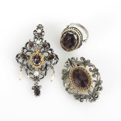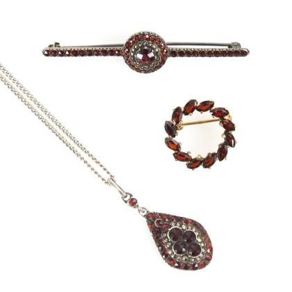 Granatarmreif und 2 Broschen Ende 19. Jh.