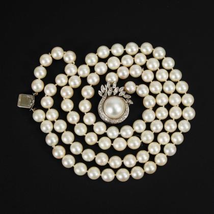 2-reihige Zuchtperlenkette mit Mabézuchtschalenperle und Diamanten.