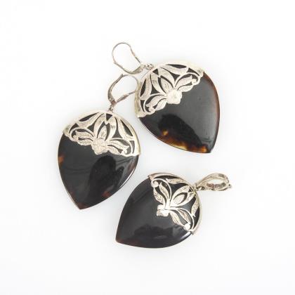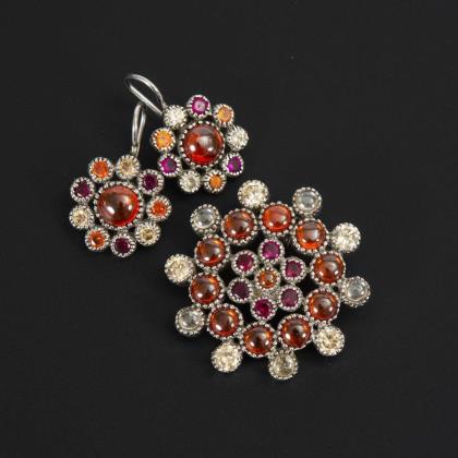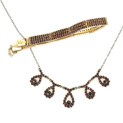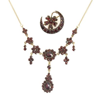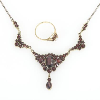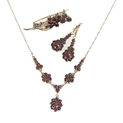 Granat-Collier, Ohrhängerpaar und Zweigbrosche.