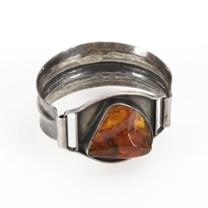 Große Zierschließe mit Bernsteinsegment zwischen breitem Reif. Einhängehaken