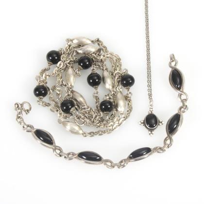 Ankerkette mit Onyxkugeln und Silbergliedern. Armband und kleiner Anhänger an kurzer Kette mit Onyxcabochons. Ringfederschließen