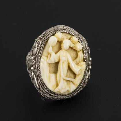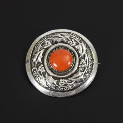 Reliefierte Brosche mit Korallencabochon. Hakenverschluss