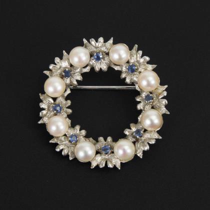 Kranzbrosche mit Zuchtperlen und Saphiren.