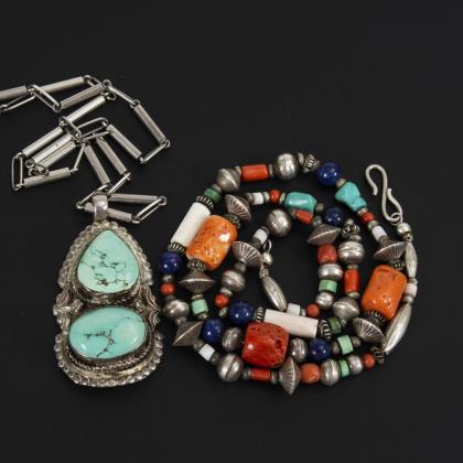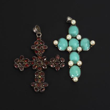 2 Kreuzanhänger mit Türkisen, Zuchtperlen und Granaten.