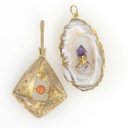 Art-déco-Anhänger mit Koralle und Markasiten. Moderner Achatanhänger mit kleiner Amethyststufe
