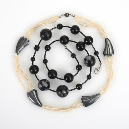 2 Ketten mit verschiedenen Steinen und Zuchtperlen.