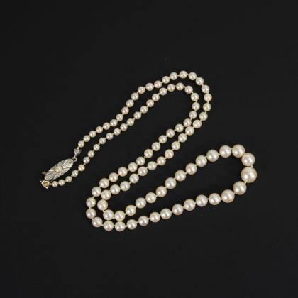Schnürketten mit Zuchtperlen in Einzelverknotung, an großer Zierschließe mit Mabézuchtschalenperle und Diamantbesatz. Kastenschloss mit Schiebesicherung