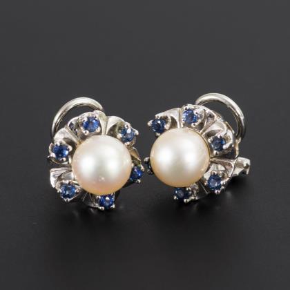 Ohrklipp-Paar mit Zuchtperlen und Saphiren.