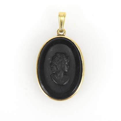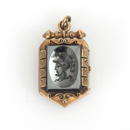 Hämatit-Tafel mit antikisierend geschnittenem Soldatenprofilkopf. 2 gerahmt verglaste Innenfächer