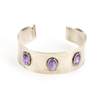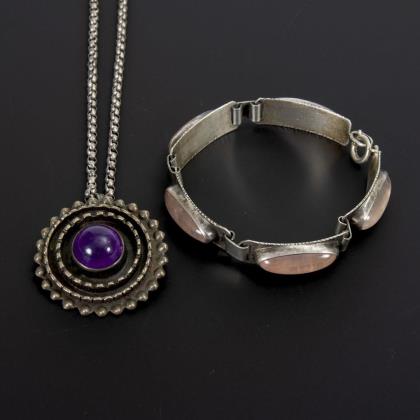 Anhänger mit Amethystcabochon, an Erbskette mit Ringfederschließe. Armband mit Rosenquarzcabochons, an Ringfederschließe