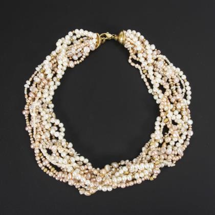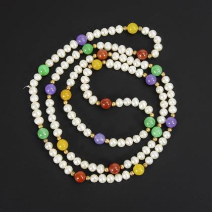Durchgehende Schnürkette mit ovoiden Zuchtperlen und farbigen Steinkugeln?