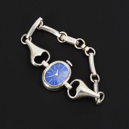 Ovales Gehäuse, Strichzahlen und Federkrone zwischen Ziergliederband mit Klippverschluss.
