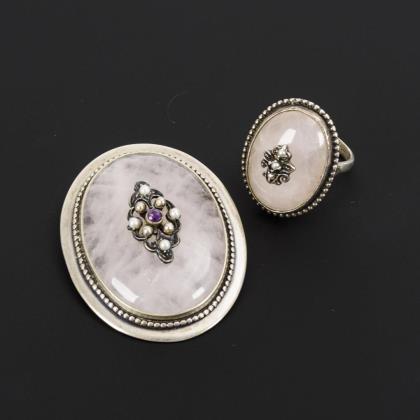 Anhänger/Brosche und Ring mit Rosenquarz.
