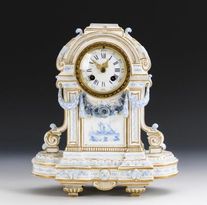 Auf einer Rundplinthe sitzende Gruppe von als Schmied mit Zange und Amboss und als Bergarbeiter mit Arschleder, Pickel und Amorschild gestalteten Putten, die sich einer die Haare kämmenden Puttendame zuwenden; darauf eine Kuppa mit purpurfarbenem Fond und Kauffahrteiszenen in zwei Vierpasskartuschen