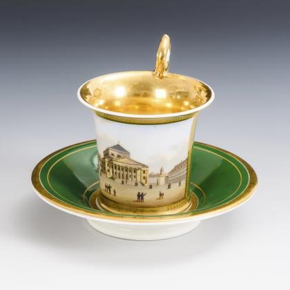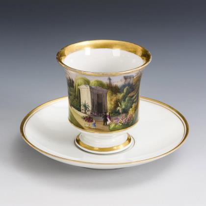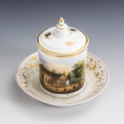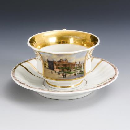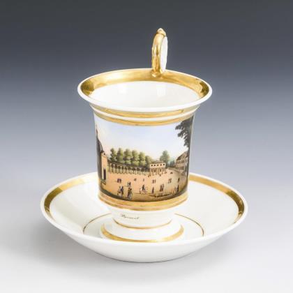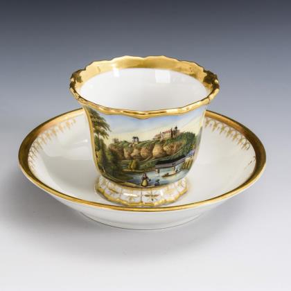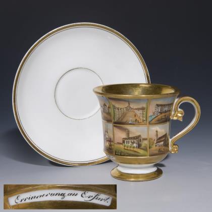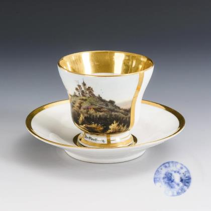Seltene Ansichten-Tasse, Untertasse. Deutsch.