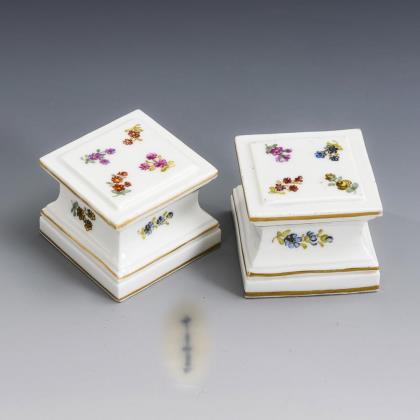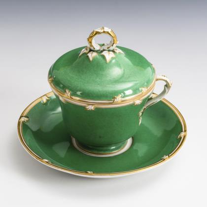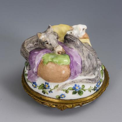 Form- und Dekor-Modell um 1780. Feine farbige florale und figürliche Bemalung, gold staffiert. Im Spiegel Rundreserve "Spielende Kinder in Landschaft". Pressmarken, Schwertermarke
