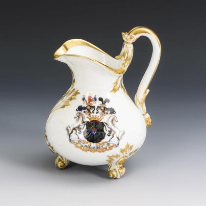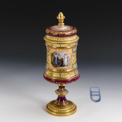 Zylindertasse mit Kraterrand, drei Tatzenfüßen und Rosettenhenkel. Schauseitig die Darstellung eines großen Wappens mit Fürstenkrone und Konstantinsorden