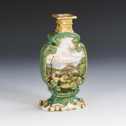 Plattkorpus mit Rocaillefuß und quadratischer Mündung. Grüner Fond mit floraler Reliefgoldmalerei, beidseitig eine jeweils unterseitig in Französisch und 1x in Deutsch bezeichnete Ansicht des Ortes Badenweiler im Schwarzwald bzw. einer Schlucht mit Brücke ("Cours de la Massa")