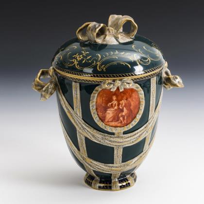 Konischer Korpus mit Blatthandhaben und weit auslappendem Mündungsrand mit zwei Blättern. Schauseitig die Darstellung einer Parklandschaft mit einem galanten Herren bzw. einer galanten Dame
